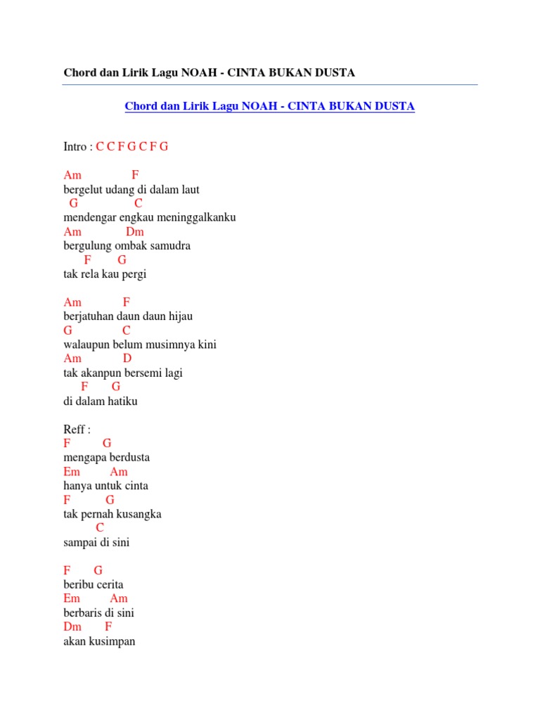 Lirik Lagu Noah Cinta Bukan Dusta / Noah andaikan kau datang official music video. Lirik Lagu Noah Cinta Bukan Dusta : Bergelut udang di dalam laut mendengar engkau meninggalkanku bergelombang samudera karena kau pergi.